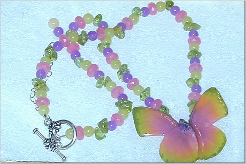SALE Genuine Butterfly, Preserved and Coated with a PolyResin. Chain composed of Peridot, yellow jade, candy jade, purple jade. Toggle Clasp. $35.00 (Original Price $50.00)